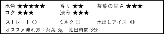 オススメ淹れ方:茶葉 3g    抽出時間 3
