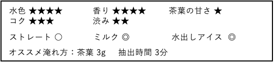 オススメ淹れ方:茶葉 3g 抽出時間 3分